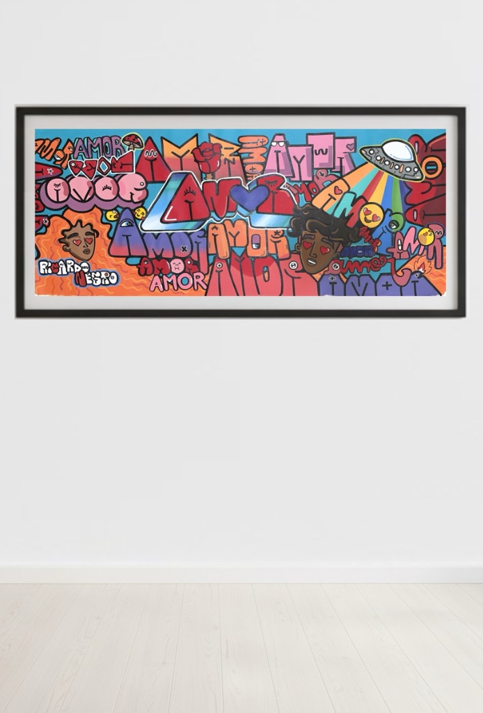 Esta é a segunda pintura do artista dedicada ao tema universal do amor. A palavra amor se repete inúmeras vezes, irradiando em tons avermelhados que percorrem a tela em formato horizontal. A obra apresenta seu estilo característico: personagens expressivos, uma nave especial, letras de graffiti, emojis e uma explosão de criatividade que se conecta em cada detalhe.